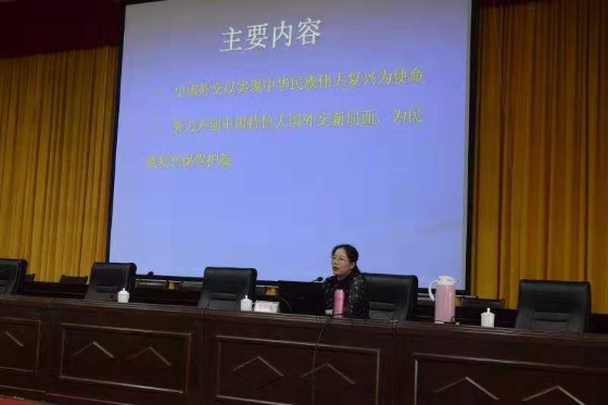 姚巧華從“新時(shí)代中國外交堅(jiān)持以實(shí)現(xiàn)中華民族偉大復(fù)興為使命”“努力開創(chuàng)中國特色大國外交新局面,為民族復(fù)興保駕護(hù)航”兩個(gè)大方面,深刻闡述了“習(xí)近平新時(shí)代中國特色社會(huì)主義外交思想”。所講觀點(diǎn)鮮明,重點(diǎn)突出,講法靈活,圖文并茂,事例貼切,語言精準(zhǔn),理論性強(qiáng),具有很強(qiáng)的指導(dǎo)性。