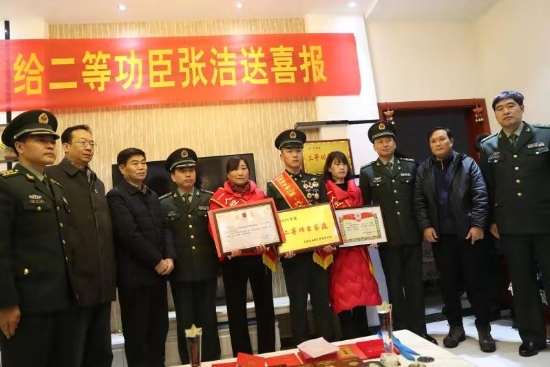 當(dāng)日上午,張潔的老家鑼鼓喧天,熱鬧非常。軍地領(lǐng)導(dǎo)在鄉(xiāng)親們熱烈地掌聲和鑼鼓聲中,帶著滿滿地祝福,專程趕到張潔家中?!皬垵嵧荆趪?guó)際軍事比武競(jìng)賽中取得第一名,榮立二等功為此特向您報(bào)喜。希望您今后多與部隊(duì)聯(lián)系,多給予張潔同志鼓勵(lì),為實(shí)現(xiàn)中華民族偉大復(fù)興的強(qiáng)國(guó)夢(mèng)、強(qiáng)軍夢(mèng)共同奮斗?!痹趶垵嵓抑?,69246部隊(duì)副政委楊富鵬代表組織宣讀了部隊(duì)賀信。