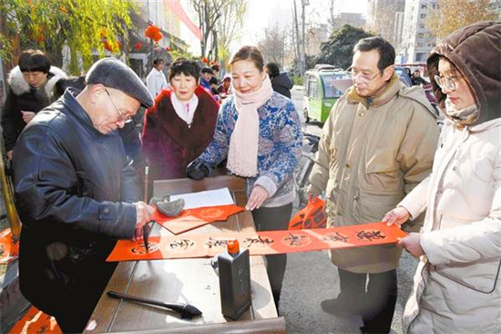 1月19日,由周口市民間文藝家協(xié)會(huì)、川匯區(qū)文聯(lián)聯(lián)合舉辦的“送萬福進(jìn)萬家”義寫春聯(lián)活動(dòng),在周口華威民俗文化博物苑門前舉行。來自市書協(xié)、川匯區(qū)書協(xié)的20多名書法家現(xiàn)場揮毫潑墨,義寫春聯(lián)和“?!弊郑艿绞忻竦囊恢潞迷u(píng)。記者 梁照曾 攝