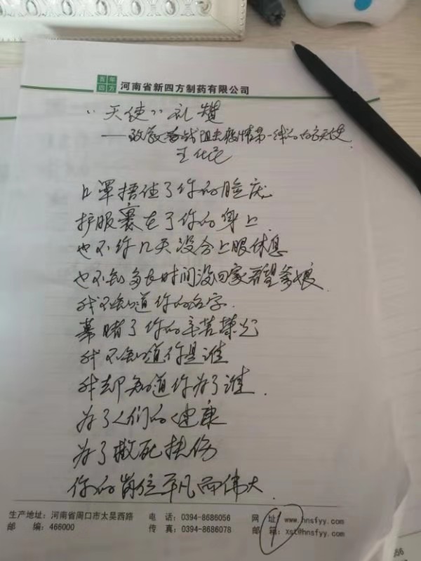 “阻擊疫情的陣容里你默默奉獻著熱和光你舍棄小家 顧著大家 心似蓮花 情滿海洋”1月30日,50多歲愛好寫詩的周口市民王化民致電記者,為了表達對奮戰(zhàn)在疫情一線白衣天使的崇敬,他特意寫了一首詩歌來禮贊。