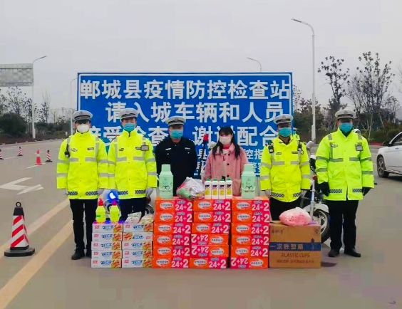 2月6日下午,周口市格林生活廣場總經(jīng)理于云帶著消毒液、噴壺、火腿腸、方便面等慰問物資,來到鄲城縣文昌大道與迎賓大道交叉口疫情防控檢查卡點(diǎn),看望慰問值勤的公安民警。