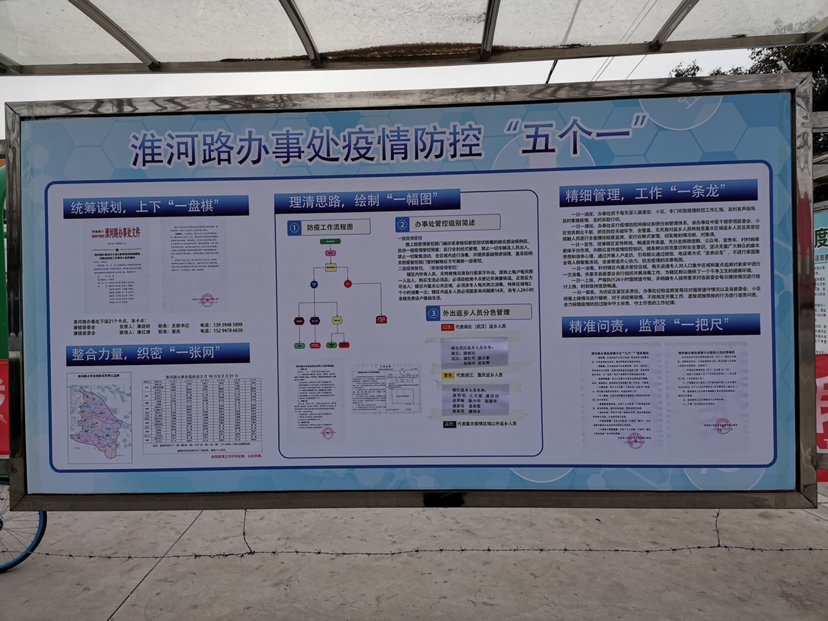 淮河路辦事處地處我市東南部,總人口約4萬。轄區(qū)黃灘、孟營、鄭洼、牛灘、劉新莊、姚灘、南徐、路莊、趙寨、麥仁店、康樓、徐莊等12個居委會,有34個自然村,114個村民組,人口約39000人、面積20平方公里。根據(jù)轄區(qū)的實疫情防控工作,淮河路辦事處探索出一套疫情防控工作“五個一”流程。統(tǒng)籌謀劃,上下“一盤棋”; 整合力量,織密“一張網”; 理清思路,繪制“一幅圖”;精細管理,工作“一條龍”;精準問責,監(jiān)督“一把尺”。