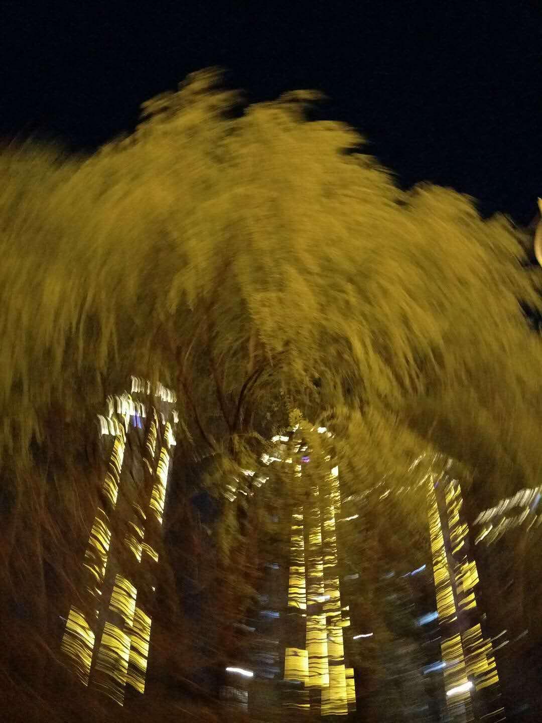路燈照耀下的紫葉李,花兒開(kāi)得繁密而明亮。