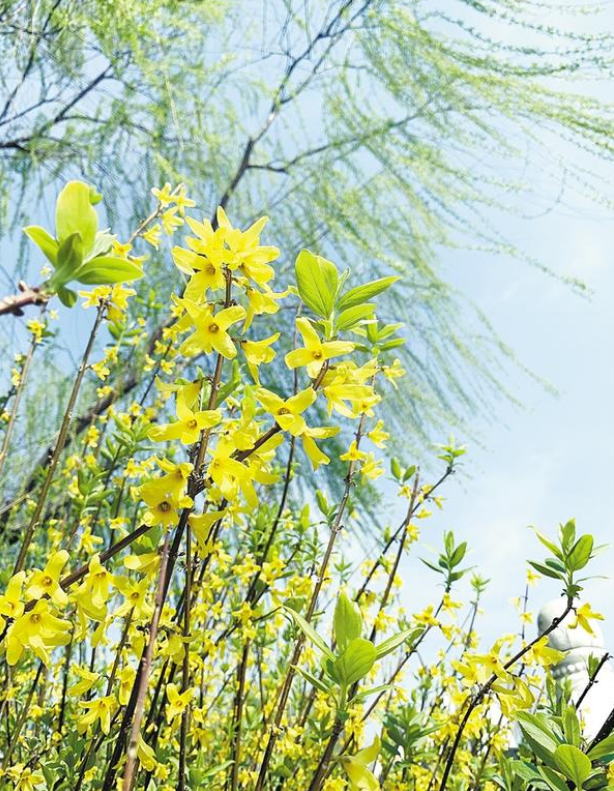 作為春天的信使,一叢叢嬌黃的連翹花,為大地帶來了濃濃春意?;ǘ湓诖猴L的吹拂下?lián)u曳,團團簇簇,涌動如金色波浪。走近之時,聞花香淡雅、賞滿枝金黃,人們也以“報春花”來稱呼它。