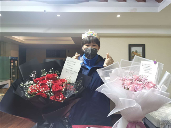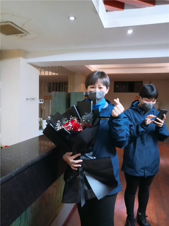 隊伍集合完畢,接下來的一幕令許聽聽始料未及。來自當(dāng)?shù)厣鐓^(qū)的工作人員,手捧蛋糕、鮮花,唱著生日歌,來到許聽聽面前,向她致以生日祝福。特殊時期,身處抗疫一線,忙于照顧病人,許聽聽此前對自己的23歲生日沒有任何憧憬,她告訴記者,其實她當(dāng)天沒想起來是她的生日,面對突如其來的生日祝福,許聽聽說:“當(dāng)時的心情既激動又感動?!?。