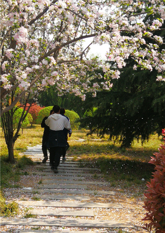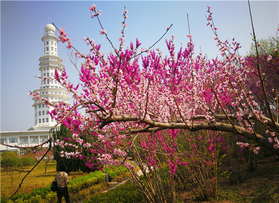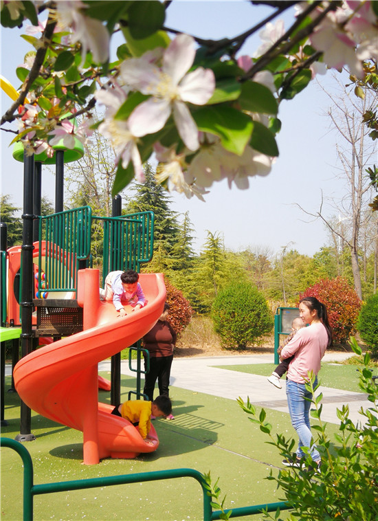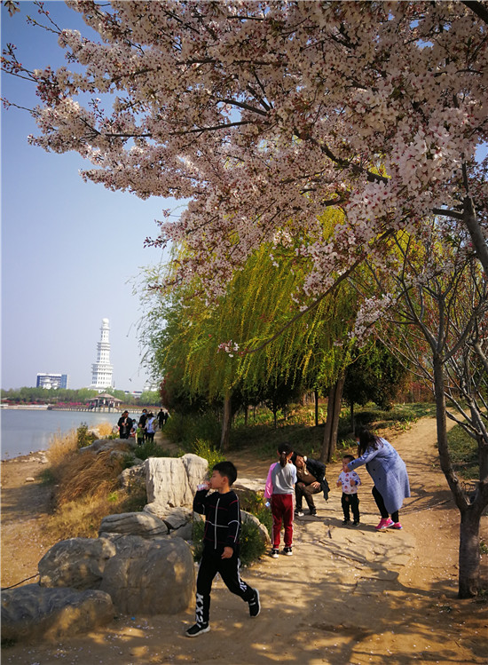 3月24日,周口公園內(nèi)櫻花、海棠、桃花、紫荊花爭相綻放,在綠樹的映襯下,遠(yuǎn)看猶如濃彩重墨的百花圖,不少市民來此賞花游玩。