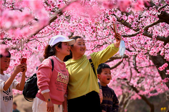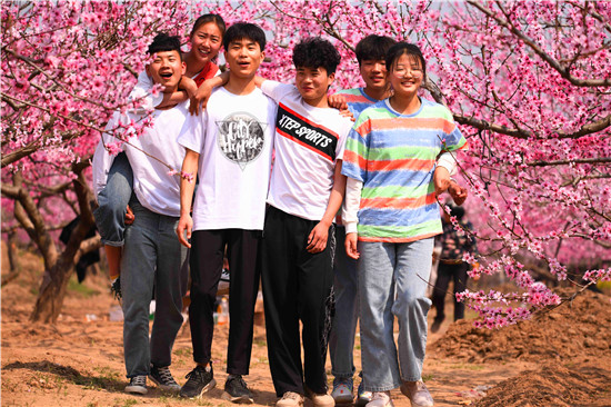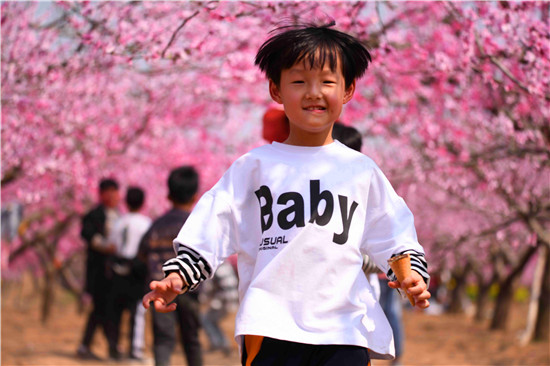 而在萬(wàn)畝桃花深處,賞花的人們也是醉不知?dú)w。大人孩子們神采飛揚(yáng),追逐賞花,探幽覓芳,玩得很嗨!還有一個(gè)時(shí)尚的人們,在桃花深處玩抖音、玩直播、拍視頻,與天下網(wǎng)友共賞花海之美。