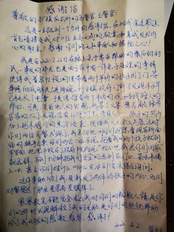 為向民警致謝,崔女士家人多次聯(lián)系馬廠派出所所長毛衛(wèi)庚說要表示感謝,都被婉言謝絕了。近日,已身在鄭州打工的崔女士每次想到那晚民警們對她們的幫助都心存感激,于是她就手寫了一封感謝信,并制作了一面錦旗,從鄭州郵寄到家里,讓親戚幫忙送到馬廠派出所以示感謝。