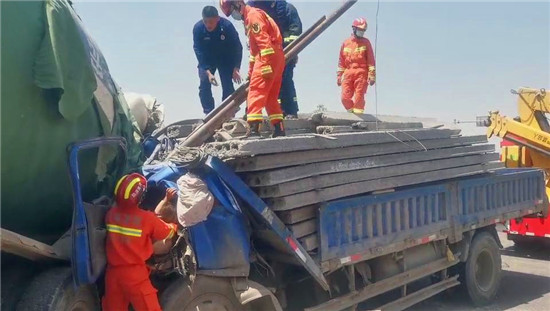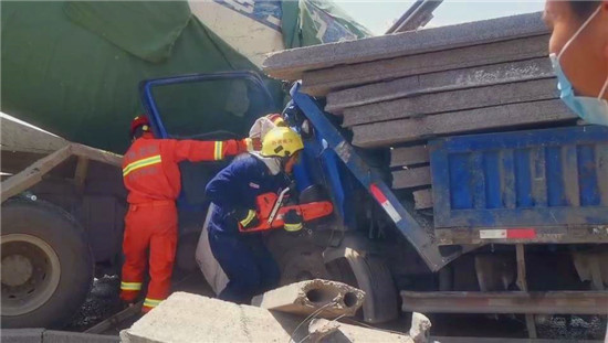 據(jù)了解,由于兩車相撞產(chǎn)生的沖擊力導(dǎo)致貨車與水泥灌車的車體緊緊連在一起,貨車駕駛員被卡在駕駛位上無(wú)法動(dòng)彈。為了能盡快將被困司機(jī)救出來(lái),現(xiàn)場(chǎng)指揮員指揮救援人員協(xié)助現(xiàn)場(chǎng)交警、路政部門立即對(duì)事故路段進(jìn)行封鎖處理,并設(shè)置安全員對(duì)過(guò)往車輛進(jìn)行警示,保證救援工作正常開(kāi)展。同時(shí),另一組救援人員首先對(duì)壓住駕駛室的石板進(jìn)行清理,然后使用液壓器材工具組進(jìn)行破拆,并對(duì)駕駛員腿部被擠壓部位進(jìn)行擴(kuò)張。經(jīng)過(guò)十五分鐘的緊急救援,被困司機(jī)被成功救出后移交現(xiàn)場(chǎng)救護(hù)車送往醫(yī)院治療。