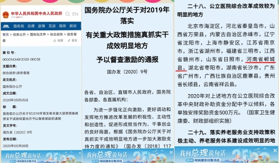 5月8日,中華人民共和國(guó)中央人民政府門(mén)戶(hù)網(wǎng)站發(fā)布《國(guó)務(wù)院辦公廳關(guān)于對(duì)2019年落實(shí)有關(guān)重大政策措施真抓實(shí)干成效明顯地方予以督查激勵(lì)的通報(bào)》國(guó)辦發(fā)〔2020〕9號(hào)文件,對(duì)213個(gè)地方予以督查激勵(lì),相應(yīng)采取30項(xiàng)獎(jiǎng)勵(lì)支持措施。其中,鄲城縣榮登“對(duì)公立醫(yī)院綜合改革成效較為明顯的地方”名錄,獲獎(jiǎng)500萬(wàn)元。