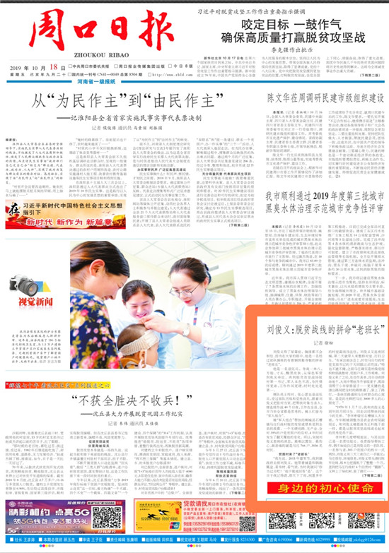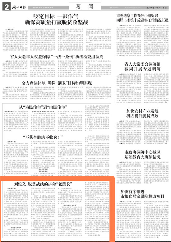 2019年10月18日,《周口日報》頭版轉版,以《劉俊義:脫貧戰(zhàn)線的拼命“老班長”》