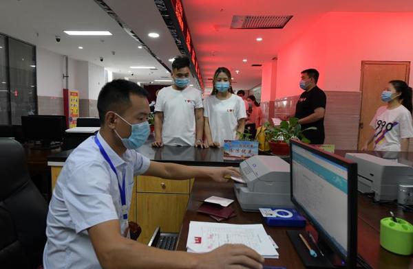 “你就是因?yàn)橐咔榉揽赝七t婚禮的那個(gè)警察吧!”5月20日上午,在鹿邑縣民政局婚姻登記大廳,工作人員看了身份證件后立即認(rèn)出了他們,專門(mén)為他們開(kāi)通了“綠色通道”;同事們一起在執(zhí)勤的崗?fù)げ贾昧讼矚庋笱蟮摹霸苹槎Y”場(chǎng)地,與他們一起分享幸福的喜悅。