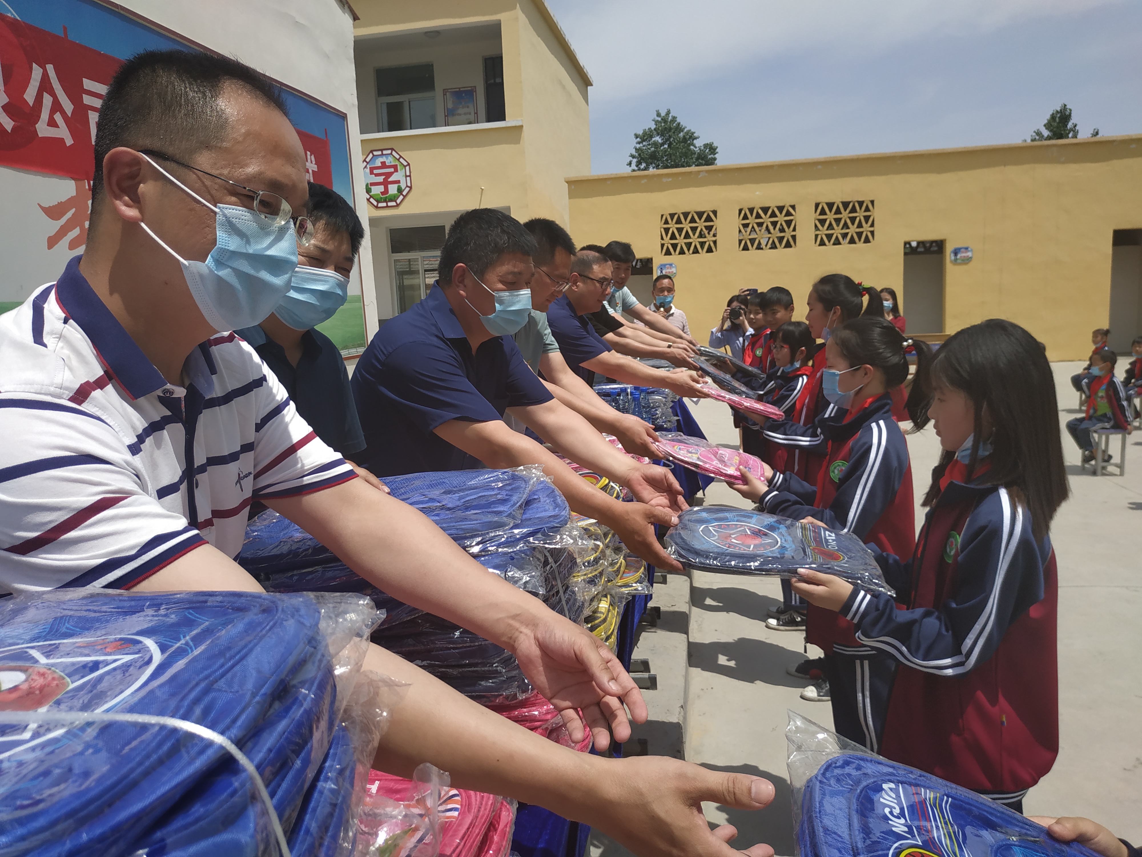 5月21日,河南同和堂醫(yī)藥有限公司與部分周口愛心人士,穿過滾滾麥浪,來到市醫(yī)保局定點(diǎn)扶貧村——項(xiàng)城市新橋鎮(zhèn)北李營行政村,為村小學(xué)的學(xué)生們送去200個書包,向他們提前送上六一兒童節(jié)的祝福。