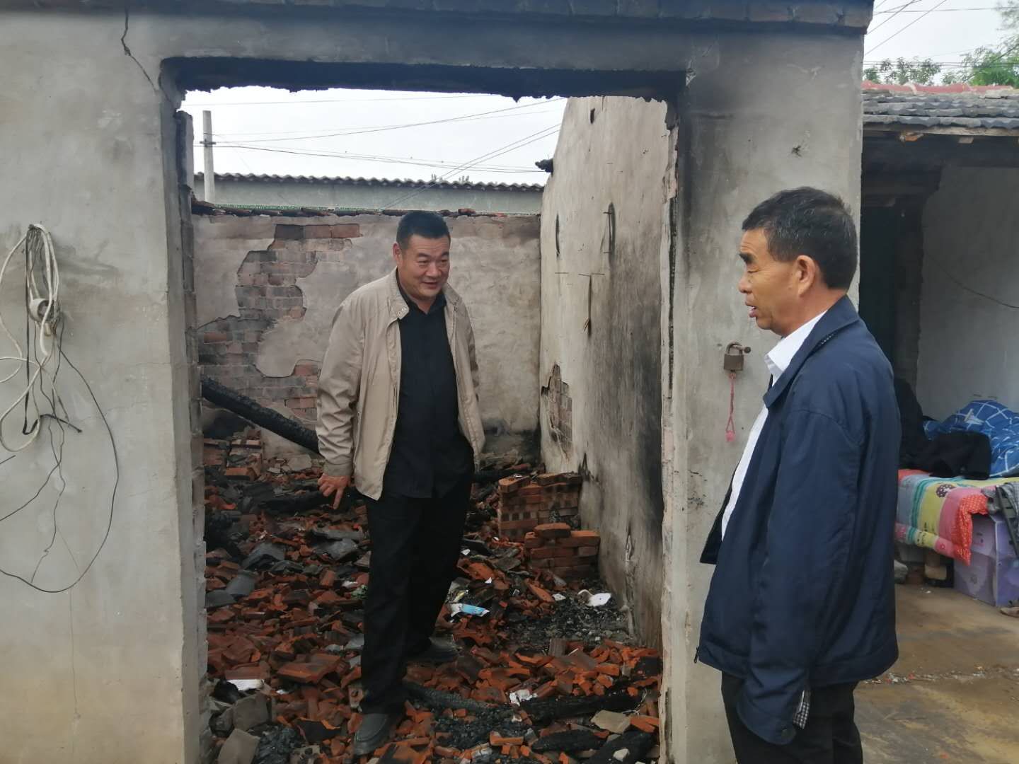 聽完情況后,督導(dǎo)組立刻和駐村工作人員一起到李洪范家查看情況,現(xiàn)場主屋已經(jīng)全部燒毀,屋里到處是瓦礫......李洪范站在被燒毀的房屋里,表情木納的自言自語道“燒得一干二凈,什么都沒了,這以后咋弄呀。”現(xiàn)場詢問其生活情況時(shí),李洪范說,“當(dāng)天,鄉(xiāng)里邊就送來了米、油和錢。村長也送來了幾件衣服,現(xiàn)在就是沒有地方住?!?/p>