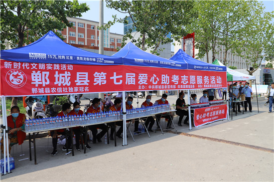 7月7日清晨,鄲城縣的志愿者們在考點外搭建“愛心助考志愿服務”站點。為考生免費提供瓶裝水、防暑應急藥品等用品,為等在考場外的家長們提供臨時休息場所、飲用水等服務,在炎熱的夏日里為他們送上一份清涼和安心,為高考學子助考加油。同時,志愿者維持考點周邊市容環(huán)境的整潔有序,對于大聲喧嘩等不文明行為及時勸阻;協(xié)助交警疏導交通,減少道路噪音對考試的影響,確保道路交通安全有序。
