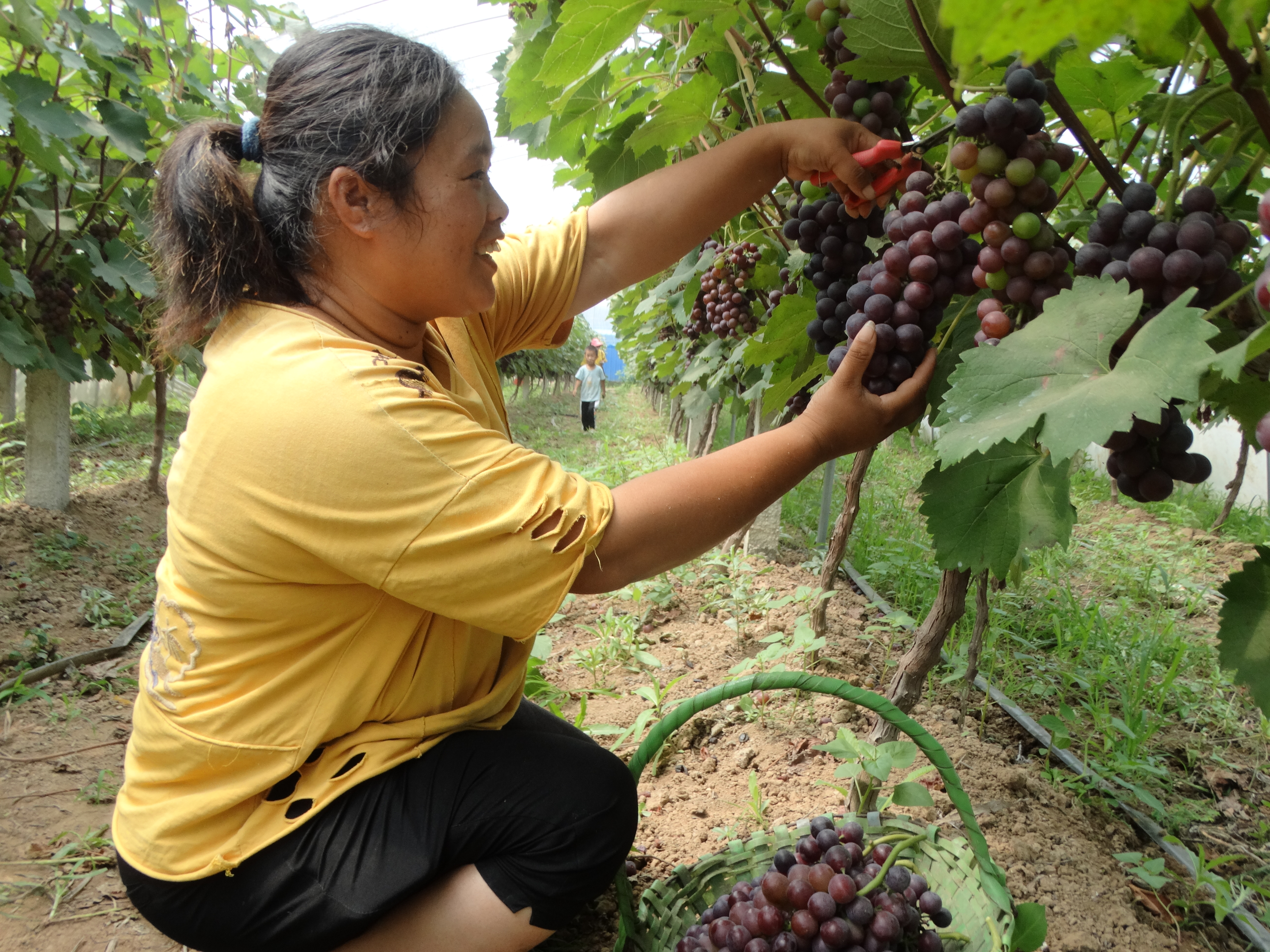 7月20日,沈丘縣周營鎮(zhèn)王寨村返鄉(xiāng)農(nóng)民工王紅兵創(chuàng)辦的大棚生態(tài)葡萄采摘園基地內(nèi),當(dāng)?shù)夭簧偃罕娫隗w驗(yàn)休閑采摘葡萄、拍視頻的樂趣。