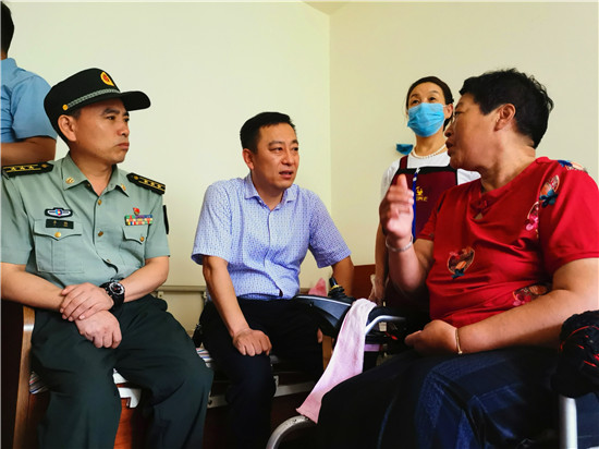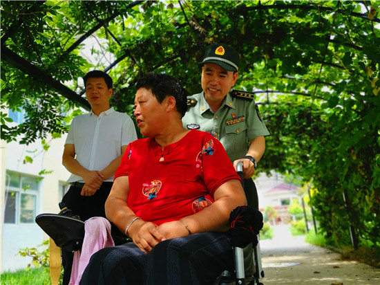 走進位于太昊路上的周口市老年護理院,院內(nèi)整潔有序、花蕊吐香鳥鳴聲聲,小徑通幽處的涼亭內(nèi)三五老人打牌、聊天,一副愜意安詳?shù)纳顖鼍?。在侯國領(lǐng)母親王玉勤居住的房間內(nèi),李揚、孫光濤等人坐在床邊與她聊天談心,看到這么多人來慰問她,王玉勤眼中流下了感動的眼淚,她對慰問人員表示感謝,說自己來護理院近一年來,吃住條件都不錯,護理院照顧的無微不至,身體一天天恢復(fù),閑暇時還能不依賴輪椅自己走上一段路。她激動地說:“感謝黨和政府的親切關(guān)懷,我最大的愿望是希望倆兒子永遠聽黨的話,在部隊安心服役、再立新功,用優(yōu)異的成績回報黨和政府對我們?nèi)业年P(guān)愛。”