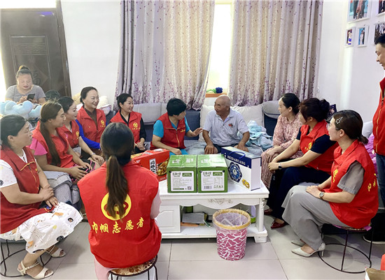 當(dāng)日下午,志愿者及愛(ài)心商家一行20多人,在駐村干部及村支部書(shū)記陪同下,來(lái)到遲營(yíng)鄉(xiāng)順河村走訪慰問(wèn)退伍老兵和老黨員,為他們送去豆奶、八寶粥、飲料、糕點(diǎn)等慰問(wèn)品。大家不顧酷暑高溫天氣,走村入戶,一家一家地走訪,為退伍老兵送去節(jié)日的問(wèn)候,聆聽(tīng)老兵講述那艱苦卓絕的戰(zhàn)爭(zhēng)和轟轟烈烈社會(huì)主義建設(shè)的歲月,讓他們感受到黨和政府及社會(huì)的關(guān)懷關(guān)愛(ài),受到好評(píng)。
