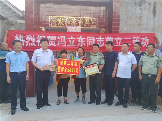 8月1日,淮陽區(qū)人武部負(fù)責(zé)人李保祥與該區(qū)退役軍人事務(wù)局局長董天祥等人一起,帶著二等功喜報及慰問金,專程趕往該區(qū)四通鎮(zhèn)葉莊行政村前馮橋村現(xiàn)役軍人馮立東家中。此時,村里鑼鼓隊敲響了,村民走出家門紛紛前來觀看,頓時贏得村民的一片喝彩及點贊聲。許多村民說:“孩子在部隊立功授獎,作為軍屬可真是光榮呀!”(記者孫安平 通訊員 張然 張航碩 攝影報道)