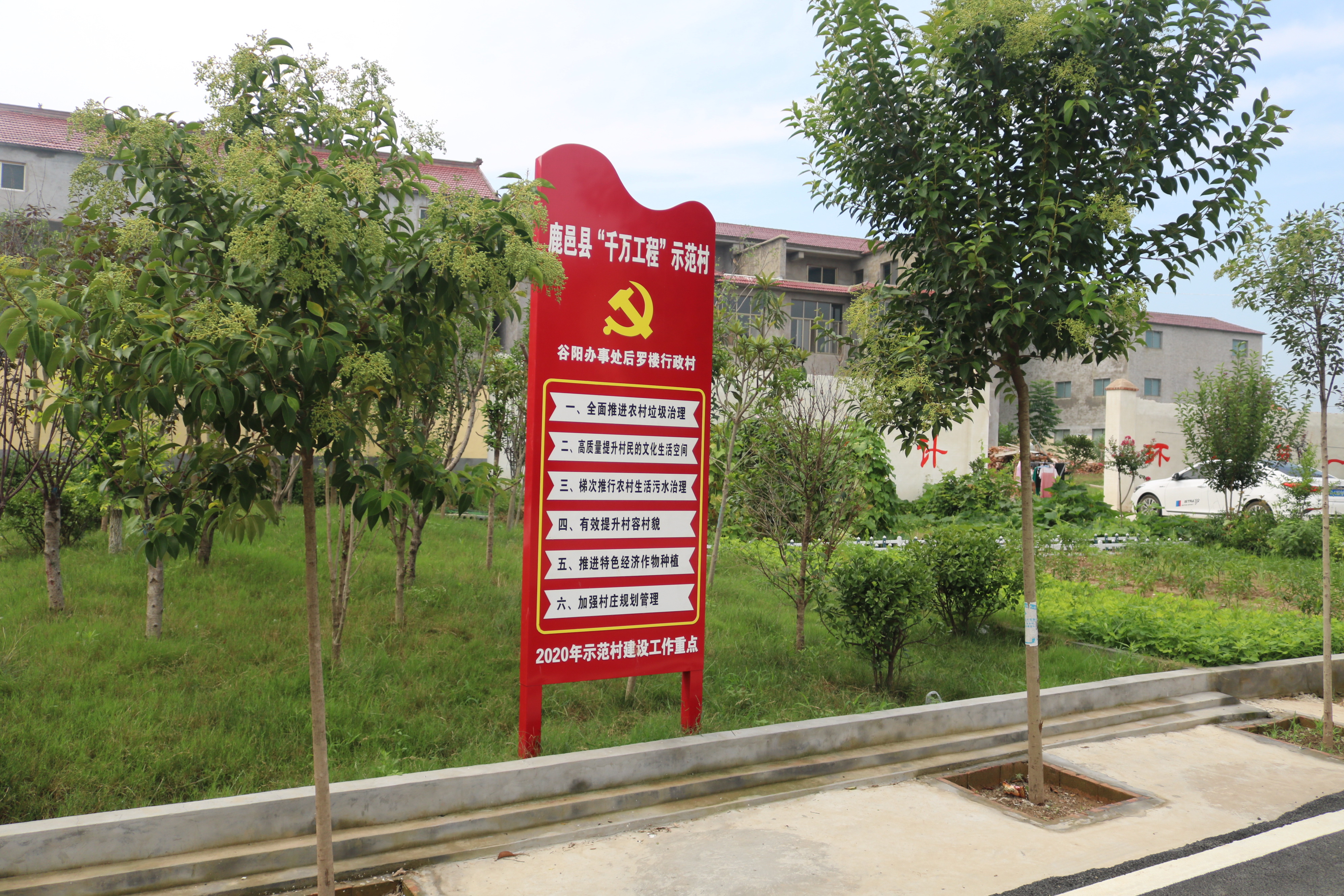 從該縣紫氣大道中段出發(fā),大約10分鐘的車程便抵達了后羅樓村。在該村東入口,一塊標注有“鹿邑縣千萬工程示范村——后羅樓村”的標牌格外引人注目。走進村中,看到的是一棟棟錯落有致的樓院,一條條新修的進村道路標線施劃有序、整潔的村道兩旁點綴著蔥郁的果樹,一幅恬靜悠然、生態(tài)宜居的美麗鄉(xiāng)村景象呈現(xiàn)在眼前。該村村室位于村南頭,在鮮花的果樹的掩映下,幾個保潔工作正在黨群服務中心和群眾文化廣場對面的果園除草,村室內工作人員正在為前來辦事的村民辦理公務。
