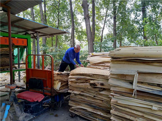 8月28日,商水縣練集鎮(zhèn)馬莊村的四紅木業(yè)有限公司板材加工車間內(nèi),機器轟鳴,工人忙著斷木、打圓、卷板,一張張板材被切割后,拉到曬板場晾曬。“有了這份收入,去年全家脫貧摘帽?!闭谲囬g里搬運板材的馬莊村貧困戶王天林對記者說。