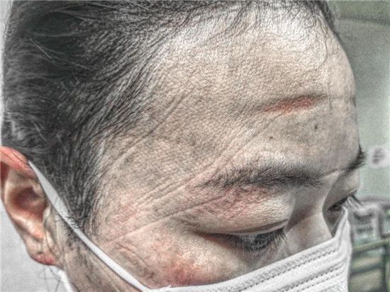 因?yàn)樾鹿诜窝椎膹?qiáng)傳染性,胡奔奔每次去病區(qū)上班都要全副武裝,而且為保證在6個(gè)小時(shí)的工作時(shí)間內(nèi)不被暴露,不能去衛(wèi)生間,不能喝水,還要穿上成人紙尿褲以防萬一。這樣下來,汗?jié)褚路浅J?,而且下班后脫掉防護(hù)裝備后,她原本清秀白皙的臉上,滿是深深的皺褶,久久難以恢復(fù),惹人心疼。給家人報(bào)平安時(shí),胡奔奔甚至不敢視頻聊天,只能語音安慰家人。