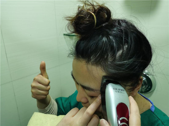 出征武漢之前,為減少感染自己、感染別人的風(fēng)險(xiǎn),出生于1991年、和同齡人一樣愛美的胡奔奔毅然決定同意剃去一襲披肩長發(fā)。這頭秀發(fā),胡奔奔留了多年,曾經(jīng)看得跟生命一樣珍貴,但疫情險(xiǎn)惡,她義無反顧。