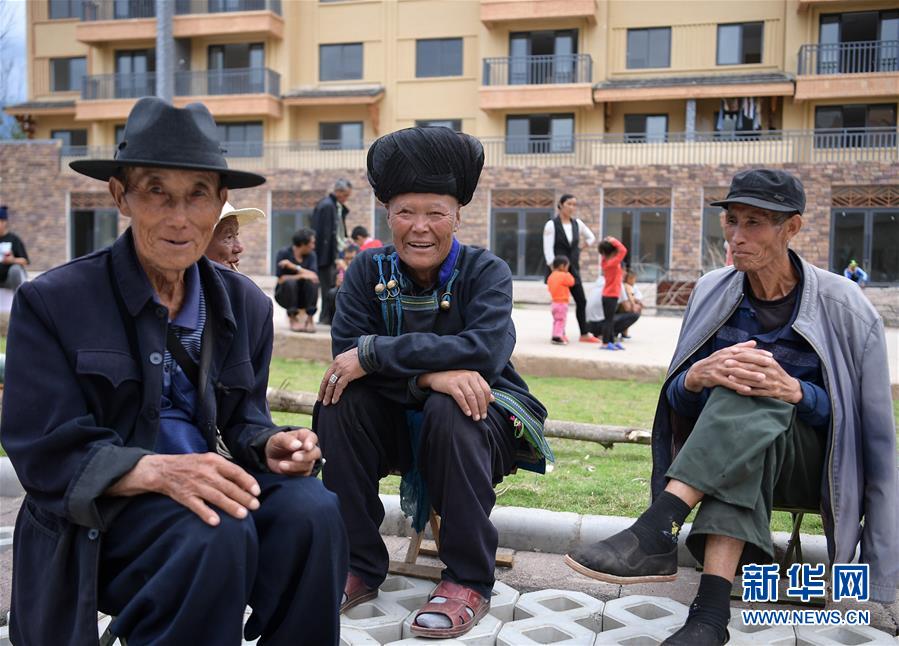 搬下山的人們,住進了有彝族傳統(tǒng)建筑風格的新社區(qū),老人們常聚在街邊休閑(8月11日攝)。 新華社記者 李賀 攝