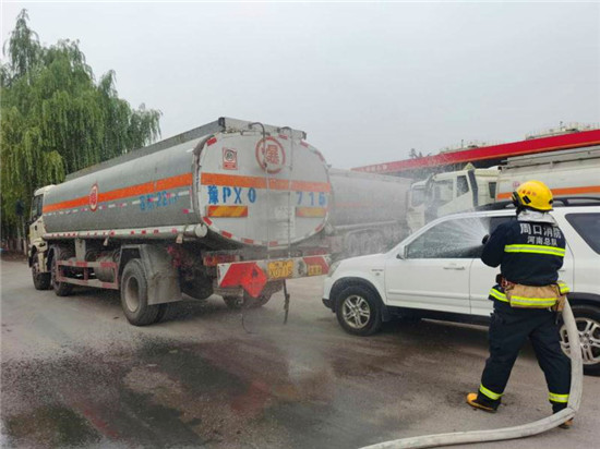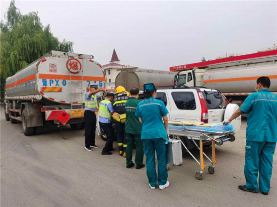 當日上午10時,商水交警大隊指揮中心接到報警:在商水縣興商大道與陳勝大道交叉口西、湯莊油庫處,一輛轎車與一輛?;饭捃囎肺蚕嘧玻9摅w損壞,危化品泄露起火,轎車駕駛室變形,駕駛?cè)吮焕к噧?nèi),如不及時救援,駕駛?cè)擞猩kU,另外因事故現(xiàn)場臨近湯莊油庫,如不及時處置可能發(fā)生爆炸,后果不堪設想。