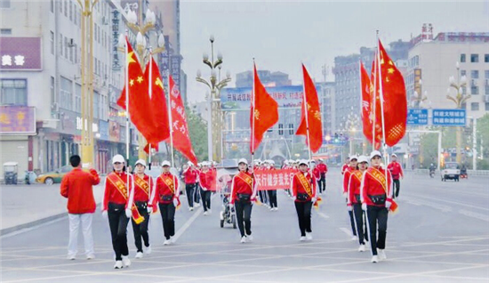 10月11日早晨,鄲城大街上迎來(lái)了一道靚麗的風(fēng)景線——他們身著鮮艷的紅色運(yùn)動(dòng)服,肩扛五星紅旗,手扯橫幅,隨著動(dòng)感十足的音樂(lè),昂首闊步徜徉在金色的秋天里……
