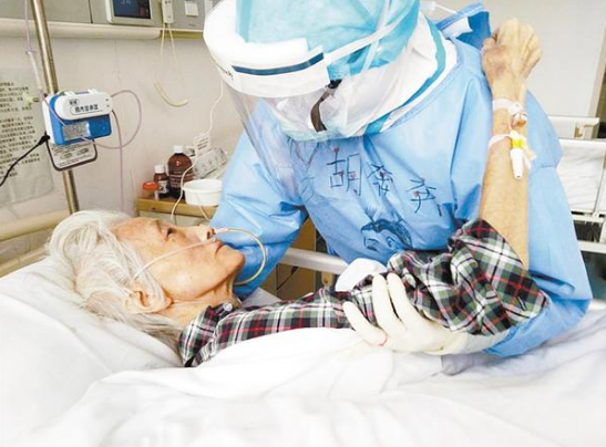 在武漢醫(yī)院,今年84歲的楊守振不僅感染新冠肺炎,而且有嚴重的營養(yǎng)不良,插著胃管,身體極為消瘦,生活不能自理。為了不讓老人出現(xiàn)壓瘡,胡奔奔需要每隔一個小時為老人翻一次身。翻身時候,為了讓老人更舒服一點,她每次都像抱孩子一樣把老人抱在懷里,動作輕柔地按摩老人受壓的部位,防止壓瘡的形成。