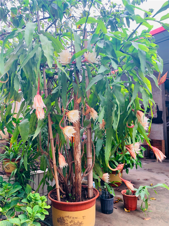 在周口市中心城區(qū)的一個(gè)家屬院里,記者見(jiàn)到了88歲的苗天才和他養(yǎng)的曇花,“一株21年樹(shù)齡的曇花開(kāi)了43朵,另外兩株5年樹(shù)齡的曇花加起來(lái)開(kāi)了13朵,這3株曇花一共開(kāi)了56朵?!泵缣觳耪f(shuō),早上四五點(diǎn)的時(shí)候曇花就慢慢地開(kāi)放了,到現(xiàn)在五六個(gè)小時(shí)過(guò)去了曇花還保持著開(kāi)放狀態(tài)。