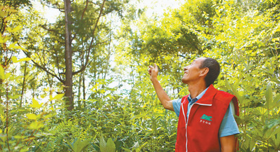 張福忠在山林里?! ∮浾?李家鼎攝 |