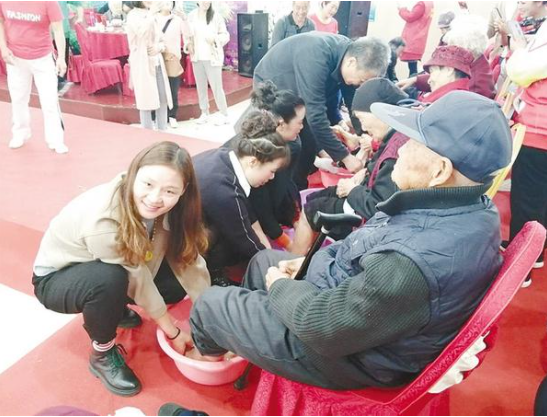 重陽(yáng)節(jié)當(dāng)天,周口市總工會(huì)、周口市教體局、川匯區(qū)供銷社在鴻運(yùn)酒店舉辦“九九重陽(yáng)節(jié) 濃濃敬老情”孝老愛親活動(dòng),邀請(qǐng)200多名社區(qū)老年人及家屬參加?;顒?dòng)現(xiàn)場(chǎng),家屬為老人進(jìn)行了洗腳(如圖),主辦方安排了精彩的文藝演出,博得觀眾陣陣掌聲,讓社區(qū)老人過了一個(gè)歡樂祥和的重陽(yáng)節(jié)。