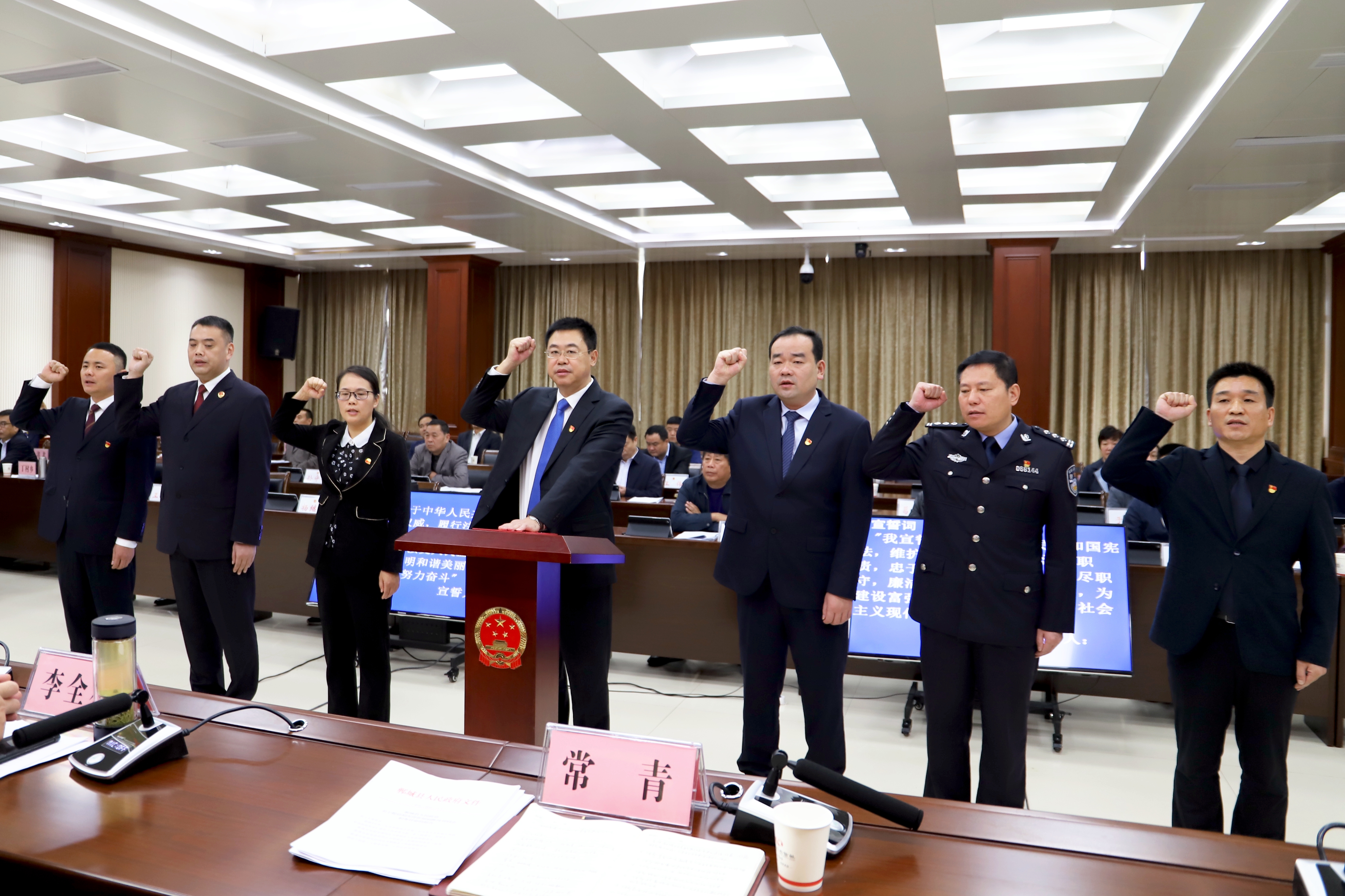 李建軍向新任命同志頒發(fā)任命書;在縣人大常委會(huì)組成人員監(jiān)誓下,新任命的同志由常青領(lǐng)誓向憲法進(jìn)行了宣誓。