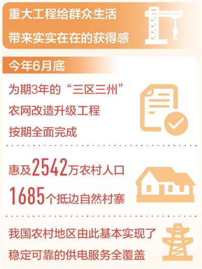從“用上電”到“用好電”,今年6月底,為期3年的“三區(qū)三州”農(nóng)網(wǎng)改造升級工程按期全面完成,惠及2542萬農(nóng)村人口、1685個抵邊自然村寨,我國農(nóng)村地區(qū)由此基本實現(xiàn)了穩(wěn)定可靠的供電服務(wù)全覆蓋。
