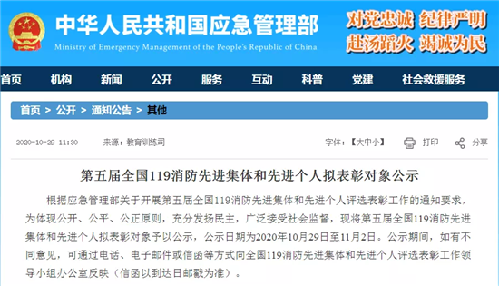 此次評(píng)選表彰工作堅(jiān)持公開、公平、公正的原則,按照自下而上、逐級(jí)推薦、民主擇優(yōu)的方式進(jìn)行,11月2日公示結(jié)束。據(jù)悉,這是首次將新組建的國(guó)家綜合性消防救援隊(duì)伍及其指戰(zhàn)員納入該獎(jiǎng)項(xiàng)評(píng)選表彰范圍。
