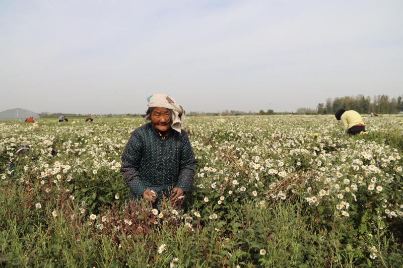 “這活兒輕,像摘棉花一樣,權(quán)當(dāng)閑著沒事兒來玩兒了。我這年齡大了,不比他們年輕人,一天才掙五六十文兒?!?6歲的脫貧致富戶晉秀云來自晉老家行政村閆莊村,和老伴陳克平相依相伴。就這樣在村里打個零工,幫助種植合作社除草、施肥、摘花、澆水,再加上黨委政府的照顧,二人順利脫貧。“關(guān)鍵是干這活兒甜蜜呀,聽說這菊花賣到外地都是有錢人泡茶喝的,俺這貧困戶能嘗到第一道鮮兒。”說著,晉秀云挑一朵開得艷的菊花放進口中,臉上露出了幸福的笑容。