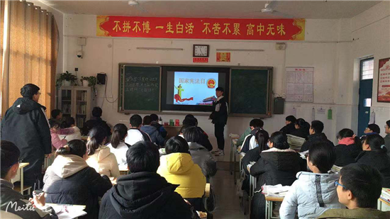 扶溝縣高中二(6)班學(xué)生楊毅說:“通過學(xué)校開展的學(xué)憲法活動(dòng),了解了很多和生活息息相關(guān)的法律知識(shí),增強(qiáng)了法治觀念,我要做尊法、守法、護(hù)法的好少年。”