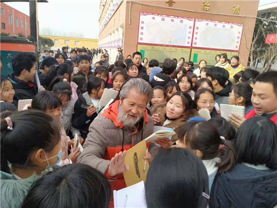 書畫家們的到來,受到學(xué)子們的歡迎,千名學(xué)生將書畫家們團團圍住,像追星一樣,討教書法藝術(shù)。書畫家門興致盎然,揮毫潑墨,留下 “上善若水”“業(yè)精于勤”、及花鳥圖、山水畫等作品100余幅,并與師生現(xiàn)場互動、傳經(jīng)送道、指點學(xué)生書法作品的得失。