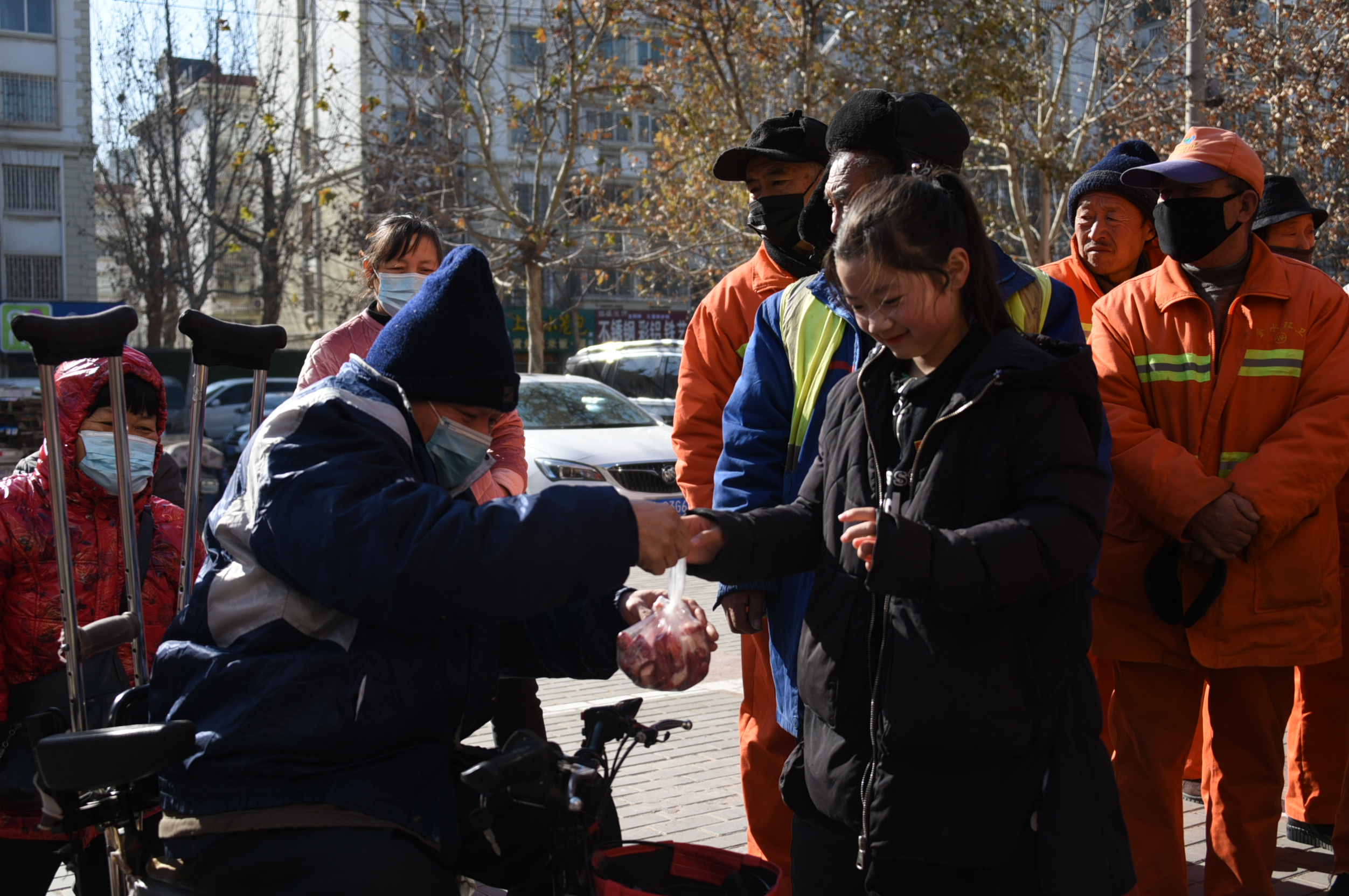 2021年1月1日上午11點(diǎn)許,在鄭州國(guó)基路守味者羊肉館店門口,數(shù)十多名身穿橘紅色的環(huán)衛(wèi)工人,十余多名殘疾人聚集在店門口等待愛心羊肉的派發(fā)。