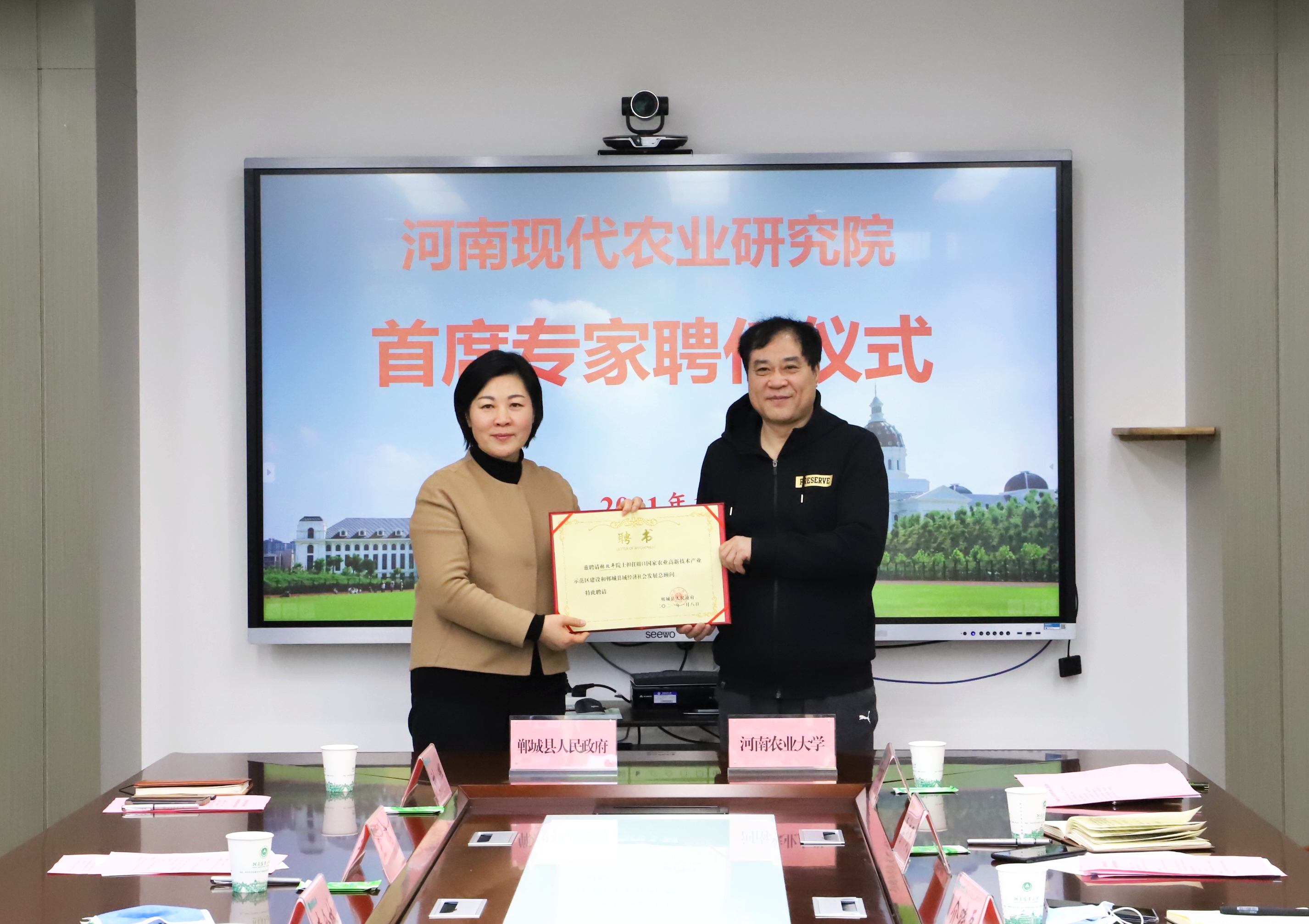 鄲城縣聘請河南農(nóng)業(yè)大學(xué)有關(guān)專家組成“河南現(xiàn)代農(nóng)業(yè)研究院首席專家團(tuán)”。羅文閣向張改平發(fā)放周口國家農(nóng)業(yè)高新技術(shù)產(chǎn)業(yè)示范區(qū)建設(shè)和鄲城縣域經(jīng)濟(jì)社會發(fā)展總顧問聘書,李全林、介曉磊共同簽署了共建河南現(xiàn)代農(nóng)業(yè)研究院備忘錄,李全林向河南現(xiàn)代農(nóng)業(yè)研究院9位首席專家發(fā)放聘書。