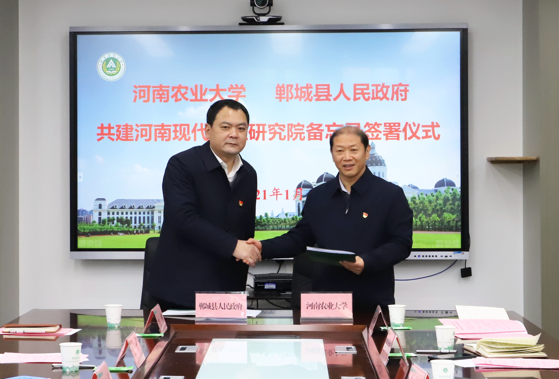 1月8日,鄲城縣人民政府、河南農(nóng)業(yè)大學(xué)共建河南現(xiàn)代農(nóng)業(yè)研究院備忘錄簽署儀式在河南農(nóng)業(yè)大學(xué)龍子湖校區(qū)舉行。河南農(nóng)業(yè)大學(xué)黨委書記魏蒙關(guān),中國工程院院士、校長張改平,校黨委副書記、副校長介曉磊,周口市人大常委會副主任、鄲城縣委書記羅文閣,縣領(lǐng)導(dǎo)李全林、王獻(xiàn)超、王偉、馬超、劉輝、蔣磊等參加簽約儀式。河南農(nóng)業(yè)大學(xué)副校長康相濤主持簽約儀式。