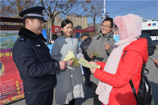為迎接第35個“110宣傳日”的到來,1月9日,扶溝縣公安局組織民警在人民公園廣場開展“一心為民110,砥礪奮進新征程”為主題宣傳活動。民警通過現場發(fā)放宣傳資料、法律宣傳、警民互動等方式介紹110社會聯動常識,教群眾如何提升冬季安全防范知識,進一步密切警民關系。圖為民警向過往群眾發(fā)放宣傳資料。