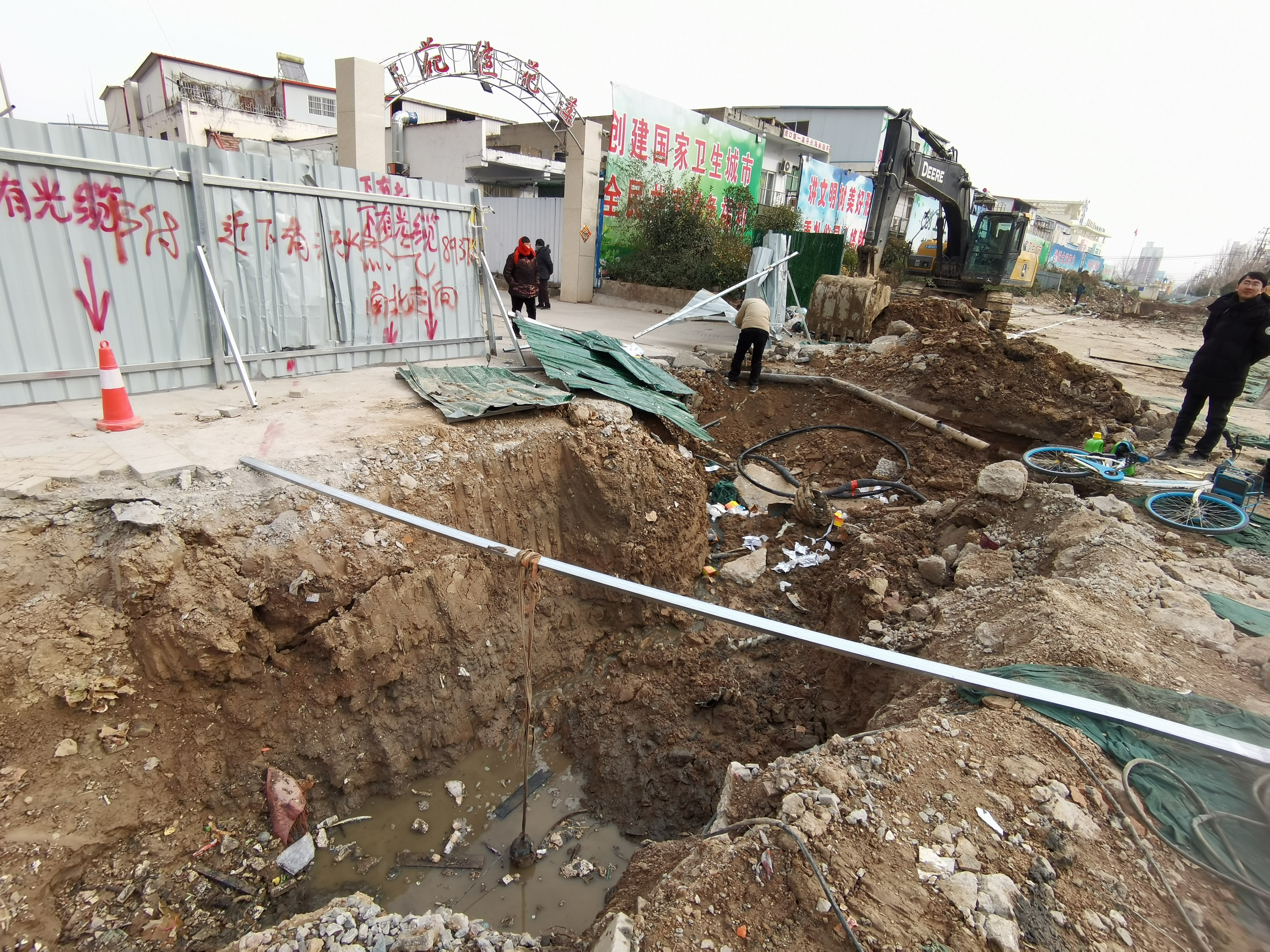當(dāng)日上午,在蓮花路中段蓮花佳苑小區(qū)門前的地下電纜外破現(xiàn)場(chǎng),一輛挖掘機(jī)停在 外破點(diǎn)的旁邊,挖斷的電纜經(jīng)過(guò)搶修后裸露在一旁?,F(xiàn)場(chǎng)施工人員介紹,此處正在進(jìn)行箱涵施工,預(yù)計(jì)春節(jié)前能夠完工。