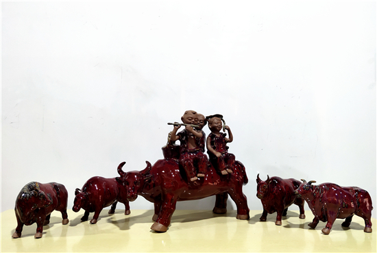 春節(jié)前夕,鄲城泥塑大師張振福歷時多日制作一組鈞瓷泥塑群雕《瑞牛賀新春》。該組作品分為三頭長約90厘米的大牛和若干頭小牛,均為鈞瓷泥塑,采用豫東黃泥和粗獷手法制作,上釉時入窯一色,歷經(jīng)1200多攝氏度高溫?zé)坪蟪龈G萬變,十分精彩。拓荒牛精神,展現(xiàn)中國人自立自強的志氣;孺子牛精神,體現(xiàn)在創(chuàng)造美好生活的時代課題中;老黃牛精神,貴在“心有大我、至誠報國”的奉獻(xiàn)品格。