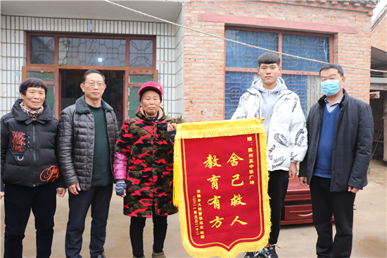 得知張廣坤所在學校的領導和老師要來村子,被救4歲男孩張子豪的奶奶帶著事先制作的錦旗來到張廣坤家說,原本打算把錦旗送到學校,感謝陳州高中培養(yǎng)出廣坤這樣的好學生,是廣坤救了他們?nèi)摇Kf,事發(fā)當天下午5時,她在家做晚飯,一不留神,4歲的孫子獨自抱住球出門跑到村坑塘邊的空地上玩耍去了。玩耍中,孩子不慎將球踢進了水塘?!?歲的孩子能懂啥,光想著撈他的皮球,水至脖頸,害怕了哭喊起來。當日,附近沒有人,孩子身上又穿著襖,要不是被廣坤及時發(fā)現(xiàn),俺家的日子以后真沒法過?!敝v到這,男孩的奶奶直掉眼淚。