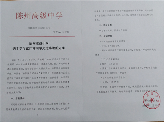 據(jù)陳州高中校長白子興介紹,該校已經(jīng)向全校師生發(fā)起學習張廣坤先進事跡的倡議,以助人為樂為榮,熱心主動幫助他人。學校還將通過組織專題德育課、開展演講征文活動等,深入持久開展學習榜樣活動。
