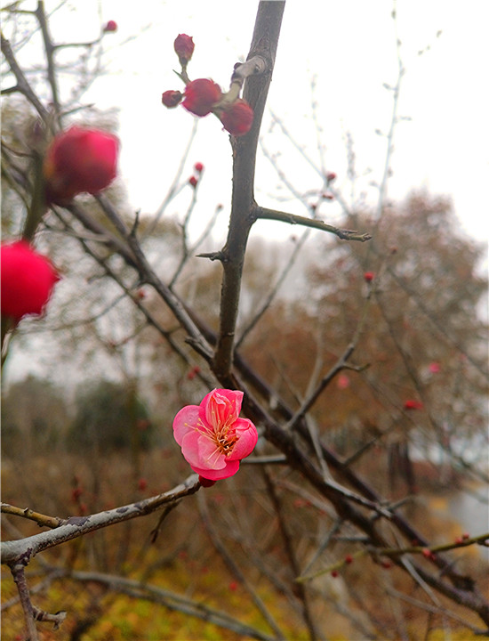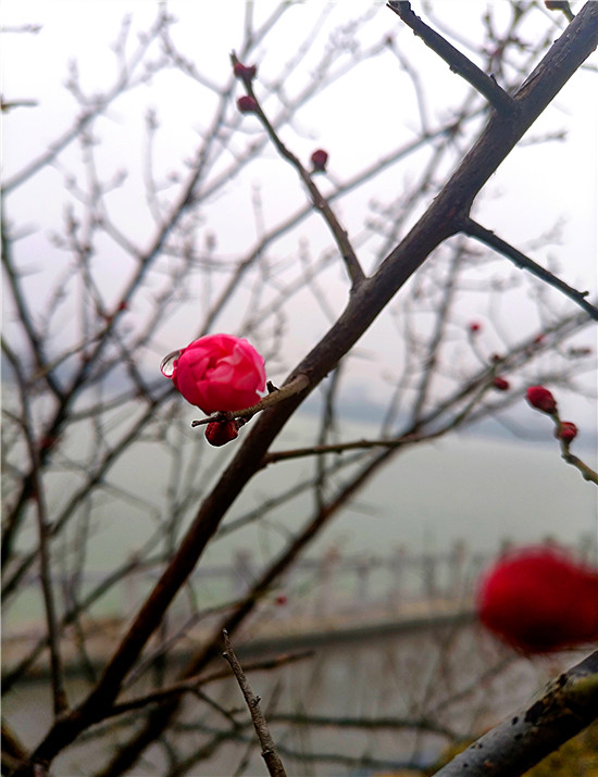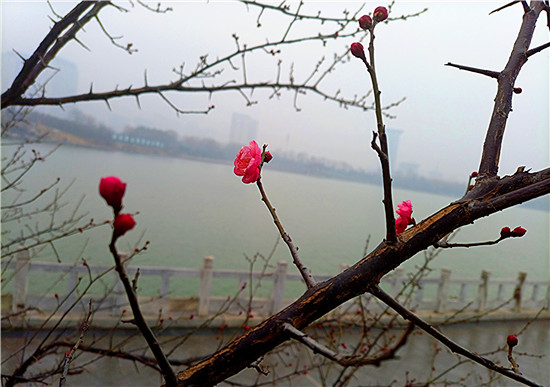 1月25日早晨,我市下了一場(chǎng)小雨。周口公園的梅樹上,幾朵梅花已經(jīng)綻放枝頭,被雨水滋潤(rùn)過后的梅花嬌艷,凝結(jié)在梅花上的小水珠晶瑩剔透,讓梅花變得別有一番詩(shī)意。