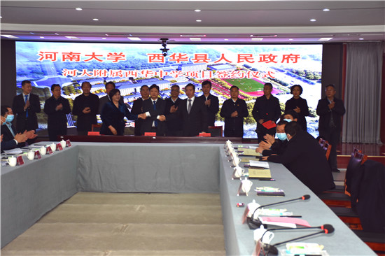 盧克平指出,西華歷史悠久,底蘊(yùn)厚重,更是盤古女媧創(chuàng)世文化圣地,經(jīng)過(guò)前期的磋商和考察,感受到了西華縣委、縣政府領(lǐng)導(dǎo)班子的開放包容和西華經(jīng)濟(jì)社會(huì)發(fā)展的大格局、大氣魄、大成就,感受到西華縣委縣政府重視教育教學(xué)的大決心和大發(fā)展。河南大學(xué)愿意在此次合作基礎(chǔ)上,與西華牽手,在基礎(chǔ)教育方面共同努力,共同推動(dòng)周口經(jīng)濟(jì)社會(huì)發(fā)展。相信經(jīng)過(guò)雙方共同努力,河南大學(xué)附屬西華中學(xué)一定會(huì)辦出特色辦出水平。